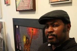Darryl standing in front of painting 26th street New York City gallery circa. 2014